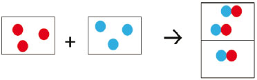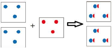 Nesse momento, é interessante questionar o porquê "as leis volumétricas" de Gay-Lussac tanto incomodaram Dalton? Como já apresentado anteriormente, Dalton precipitadamente inferiu que caso a lei de Gay-Lussac estivesse correta, então todos os gases possuiriam o mesmo número de átomos em um dado volume em uma certa condição de temperatura e pressão. Ele logo notou que essa conclusão trazia grandes problemas para suas ideias, pois, por um lado invalida a sua teoria das misturas dos gases que está baseada no fato de os gases terem átomos de tamanhos diferentes.53 Por outro lado, viola a sua própria teoria atômica, quando olhamos de perto o seu argumento da página 71 e a figura 3 de nosso trabalho, e também todo o seu esforço para criar um sistema de cálculo para os diâmetros e volumes dos átomos e explicar as relações volumétricas das reações químicas.54 Um outro exemplo que podemos criar para ilustrar o quanto "as leis volumétricas" - e sua interpretação equivocada por parte de Dalton - trazem de inconsistências para a teoria atômica é o caso da água. Experimentalmente, segundo Gay-Lussac, quando dois volumes de hidrogênio reagem com um volume de oxigênio, são formados dois volumes de vapor d'água. Então, vamos supor uma situação em que dois volumes de hidrogênio - a uma dada temperatura e pressão, tenham seis átomos (representados por seis esferas azuis, ou seja, três esferas para cada volume) - reajam com um volume de oxigênio (contendo três esferas vermelhas). Empiricamente, sabemos que são formados dois volumes de vapor d'água. Acontece que, para que isso ocorra, respeitando que todo gás possua o mesmo número de partículas em um mesmo volume (três partículas para cada volume), os átomos de oxigênio deveriam se dividir ao meio conforme a ilustração abaixo (Figura 4):