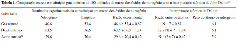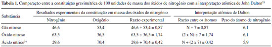 Dessa maneira, Dalton queria explicar a constituição gravimétrica não só da água, mas também das demais substâncias. Nesse empreendimento, ele determinou os pesos atômicos relativos para muitos outros átomos e, em todos os casos, usou a mesma metodologia de trabalho, ou seja, generalizou os dados da balança para os átomos usando a regra de máxima simplicidade para definir o número de átomos na molécula. Vejamos agora mais um exemplo no qual Dalton determinou o peso de um átomo. O átomo escolhido é o de nitrogênio, e em nossa discussão iremos levar em conta apenas os dados gravimétricos dos óxidos de nitrogênio e da amônia. Os três principais óxidos de nitrogênio, naquela época, e suas composições gravimétricas estão descritas abaixo (Tabela 1):