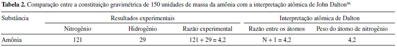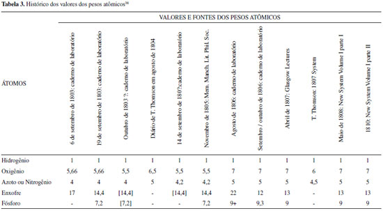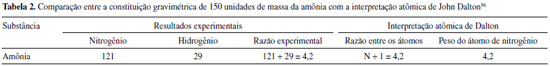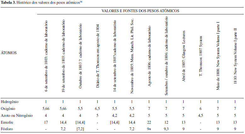 No caso da amônia, naquele momento, Dalton conhecia apenas uma substância formada apenas por nitrogênio e hidrogênio, portanto, de acordo com a regra de máxima simplicidade, a amônia deveria ser um composto binário, ou seja, formada por um átomo de nitrogênio e por um de hidrogênio. Como assumimos que o peso do hidrogênio é 1, e a razão entre as massas do experimento deu 4,2 (121 ÷ 29 = 4,2), para calcularmos o peso do átomo de nitrogênio a conta que deve ser feita é (N ÷ 1 = 4,2), chegando ao peso do nitrogênio como sendo 4,2. Esses dados trazem sérios problemas para o sistema de cálculo dos pesos atômicos de Dalton, pois o nitrogênio originado dos óxidos nos leva a crer que o átomo de nitrogênio pesa em torno de 6, já o nitrogênio proveniente da amônia nos aponta que o átomo de nitrogênio deve pesar por volta de 4. As pequenas variações no peso do nitrogênio que vêm dos óxidos (6,1, 6,1 e 5,9) são, talvez, justificáveis por "flutuações naturais" das medidas experimentais, mas, quando olhamos para o nitrogênio ora pesando 6, ora pesando 4, a diferença é bastante significativa e Dalton percebeu isso. Ele sabia que sua teoria atômica tinha problemas, tanto que, para minimizá-los, escolhia os dados experimentais que mais lhe convinham. No caso do nitrogênio, por exemplo, ele preferia escolher dados de seus contemporâneos, que superestimavam a massa do nitrogênio proveniente da amônia, e dados que minimizavam a massa do nitrogênio originado dos óxidos de nitrogênio. Por isso, ele conseguia supor que a massa de nitrogênio estaria perto de 5 para ambos os casos.37 Dalton sabia dos problemas de sua teoria, tendo em vista que mudava constantemente os valores dos pesos atômicos (Tabela 3).