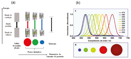 ![]() Figura 1. (a) Esquema representativo dos diagramas de níveis de energia de semicondutores nanocristalinos em função do tamanho de partícula (QDs); (b) Espectros de fluorescência em função do tamanho dos pontos quânticos. Adaptação da referência 15 (Reproduced by permission of the Royal Society of Chemistry)