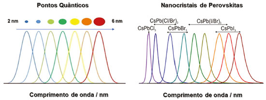 ![]() Figura 2. Imagem ilustrativa dos espectros de emissão dos QDs dependentes do tamanho e dos PQDs dependentes da composição dos nanocristais