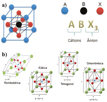 ![]() Figura 3. (a) Imagem representativa da perovskita composta por uma estrutura tridimensional do octaedro BX6; (b) Imagem representativa da distorção do octaedro BX6 da perovskita e as estruturas cristalinas passíveis para a fórmula geral da perovskita ABX3