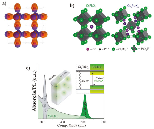 ![]() Figura 4. (a) Imagem ilustrativa da sobreposição dos orbitais p do ânion de halogênio e os orbitais s e p dos cátions de Pb2; (b) Estruturas cristalinas das fases CsPbX3 cúbica e Cs4PbX6 romboédrica (c) Representação esquemática da estrutura de bandas e espectro de absorção/fotoluminescência de NCs CsPbBr3 em matriz Cs4PbBr6. Imagens da referência 67