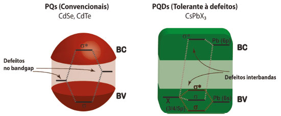 ![]() Figura 5. Representação esquemática do diagrama de energia de defeitos presentes na estrutura eletrônica dos diferentes pontos quânticos