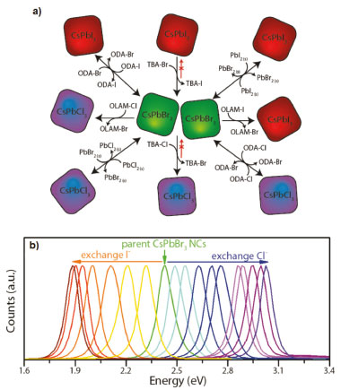 ![]() Figura 6. Representação esquemática dos diferentes processos de troca aniônica (a), espectros PL dos NCs preparados por troca aniônica (b). Imagem da referência 29