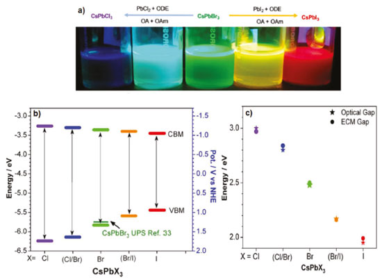 A substituição do Cl pelo I não é possível devido à grande diferença entre os raios iônicos, o que causa instabilidade do estado intermediário Cl/I. Além do rápido movimento de haletos na estrutura da perovskita, a elevada dinâmica de troca entre diferentes haletos é outra importante causa da substituição aniônica no CsPbX3.89 Assim como relatado por Kovalenko et al.,30 a morfologia e estrutura cristalina foi mantida após as substituições. Ravi et al.92 estudaram por meio de voltametria cíclica o comportamento das bandas de energia dos PQDs de CsPbBr3 e misturas de Br, Cl e I preparados por reações de substituição aniônica. Substituindo-se os haletos da CsPbX3 do Cl ao I e passando pelo Br e misturas de haletos, observou-se um deslocamento da BV de -6,24 para -5,44 eV, enquanto a BC não se altera significativamente de -3,26 até -3,45 eV, conforme pode ser observado na Figura 7.92,93