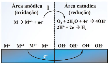 ![]() Figura 1. Ilustração esquemática mostrando as reações típicas de corrosão
