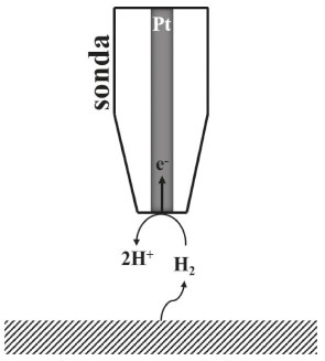 O H2 gerado pode ser detectado em uma reação de oxidação (H2 → 2H+ + 2e-) no microeletrodo de Pt quando este é polarizado no potencial de 0,0 V versus Ag/AgCl.