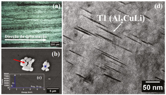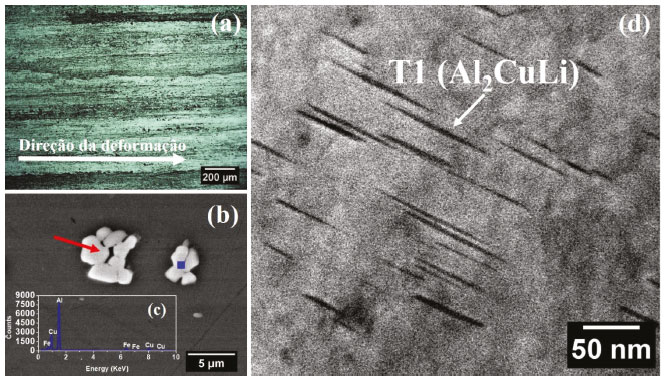 ![]() Figura 3. Características microestruturais da liga 2198-T8: (a) micrografia obtida por microscopia ótica da superfície; (b) micrografia obtida por MEV evidenciando as partículas micrométricas e (c) espectro de EDS da partícula indicada em (b); (d) micrografia por TEM mostrando a fase T1