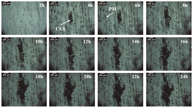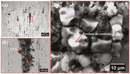 Como observado, duas formas de corrosão, a saber comuns as ligas de Al,30,31 cavidades associadas às partículas micrométricas (PM), e corrosão localizada severa (CLS), relacionada aos precipitados endurecedores,28 foram encontrados. Esses dois tipos de ataque foram observados desde as primeiras horas de imersão. O ataque associado às PM tem como principal característica o ataque ao redor das partículas. O processo se desenvolve devido à formação de micro células galvânicas onde as partículas atuam como áreas catódicas em relação à matriz, resultando na formação de cavidades ou trincheiras (trenching).28 Além disso, observou-se com decorrer do teste de imersão a formação de produtos de corrosão nas áreas associadas à CLS, como mostra a Figura 5.