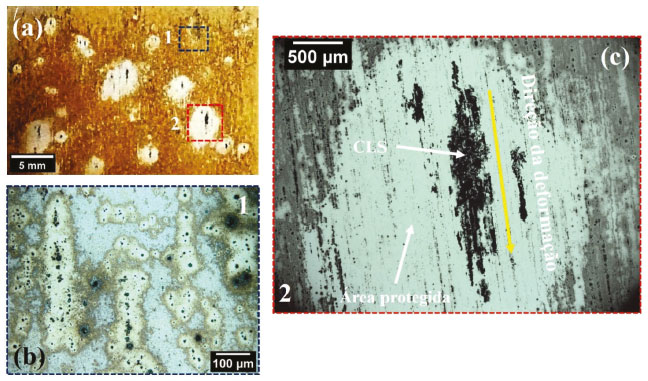 ![]() Figura 6. Macrografias da superfície da liga 2198-T8 após 24 h de imersão em solução contendo 0,01 mol L-1 NaCl. (a) Visão geral mostrando áreas de corrosão localizada severa (CLS); (b) detalhe da área indicada por 1 na figura (a) mostrando o ataque localizado relacionado com as partículas constituintes e; (c) detalhe da área indicada por 2 na figura (a) que corresponde a CLS
