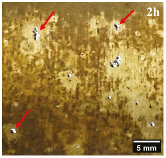 ![]() Figura 7. Macrografia da superfície da liga 2198-T8 após 2 h de imersão em solução contendo 0,01 mol L-1 NaCl. As flechas vermelhas indicam regiões com evolução de gás hidrogênio