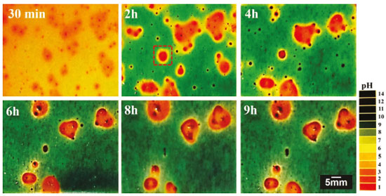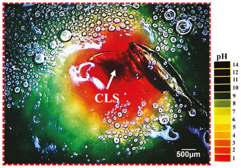A Figura 8 mostra que nas regiões de CLS, o pH atinge valores muito baixos. A acidificação ocorre principalmente dentro dos pites e resulta na evolução de bolhas de hidrogênio, Figura 7. Devido à baixa mobilidade iônica no teste de gelificação, o pH nas regiões que circundam as regiões de CLS, assume valores muito baixos, como mostra a Figura 9.
