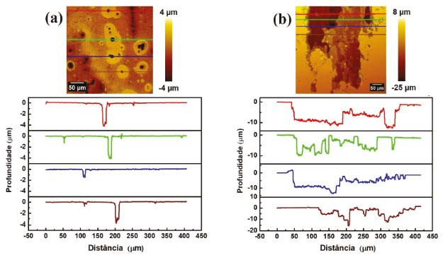 ![]() Figura 10. Perfilometria ótica da superfície da liga 2198-T8 após 24 h de imersão em solução contendo 0,01 mol L-1 NaCl: (a) ataque associado as partículas micrométricas e (b) ataque associado a CLS