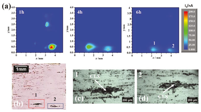![]() Figura 11. (a) Mapas de SECM da superfície da liga durante exposição à solução contendo 0,01 mol L-1 NaCl; (b) superfície da liga após o teste; (c) e (d); locais 1 e 2 associados a CLS indicados nas figuras (a) e (b)