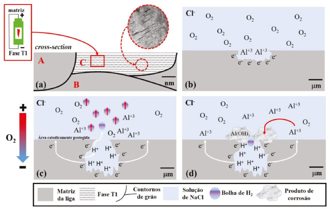 Durante o processo de fabricação das ligas aeronáuticas alguns grãos são mais deformados do que outros, Figura 12a. Assumindo que o grão C é mais deformado do que os grãos A e B, a densidade de fase T1 será maior dentro deste grão e será preferencialmente corroído, pois o par matriz/fase T1 atua como pilha galvânica. A maioria dos elementos ativos na fase T1 (Al e Li) são preferencialmente dissolvidos, ocorrendo o enriquecimento em Cu, e, consequentemente, a inversão de polaridade com a matriz da liga que passa a ser atacada,37 Figura 12b. Consequentemente, a matriz é corroída e os íons Al+3 são gerados dentro do pite, Figura 12b. A penetração da CLS atinge elevada profundidade, como mostrado na Figura 9. Dentro do pite, a presença dos íons Al+3 promovem a hidrólise da água, e os íons H+ em excesso causam a diminuição local do pH. A redução de íons H+ dentro dos locais de CLS resulta na formação de bolhas de hidrogênio. Na parte externa do pite ocorre precipitação de produtos de corrosão os quais dificultam a entrada de oxigênio, causando uma diferença de aeração da parte interna do pite a parte externa, e a mistura do meio externo com o meio interno, o que favorece a continuação do processo de corrosão, como foi observado no ensaio de gelificação, Figuras 8 e 9. As regiões vizinhas ao pite correspondem às áreas catodicamente protegidas. Todos esses fenomênos são ilustrados na Figura 12c. Na parte externa do pite, ocorre a redução do O2 produzindo OH-, os quais, ao se combinarem com os íons Al3+, causam a precipitação do produto de corrosão Al(OH)3, como mostrado na Figura 3c, nas áreas do entorno do pite, Figura 12d. O acúmulo de produtos de corrosão na entrada do pite e, consequentemente, a obstrução da entrada dele, dificulta a evolução do H2. Isso explica o aumento do pH no decorrer do teste de gelificação e a diferença de sinal medido pelo microeletrodo de SECM no decorrer do ensaio, devido à formação dos produtos de corrosão, Figura 11a.