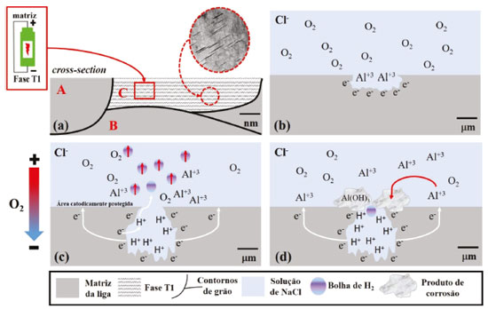 ![]() Figura 12. Diagrama esquemático do mecanismo de evolução de H2 proposto durante a corrosão da liga 2198-T8: (a) superfície após o polimento; (b), (c) e (d) reações de corrosão durante imersão na solução contendo 0,01 mol L-1 NaCl
