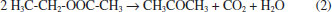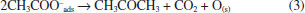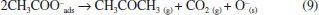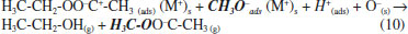 TPD results are following alcohol adsorption behavior, where primary alcohols adsorb on the surface of metal oxides without dissociation or through the scission of the OH bond as mono- (Type I) or bidentate (Type II) alkoxides.11 These methoxy species can be desorbed as molecular methanol or can react at higher temperatures (T > 300 °C), via dehydrogenation reaction (equation 1), producing formaldehyde and hydrogen.18 ![]() TPD profiles after adsorption of ethyl acetate at room temperature (Figure 3) show a low-intensity signal associated with the desorption of molecular ethyl acetate at about 100 °C (m/z = 61), along with the desorption of other species. According to the literature, ethyl acetate adsorbs in a dissociative form on the catalyst surface and desorbs forming ethanol, acetone, ethylene, and diethyl ether; further, the ethanol adsorbed can produce acetone, methanol, methane, and hydrogen.19,20 In our results, hydrogen (m/z = 2), ethanol (m/z = 46) and acetone (m/z = 58) were formed in the range of 50 - 500 °C, which confirm that ethyl acetate adsorbs in a dissociative form on the catalyst surface forming ethoxy species that desorbed as ethanol. The first peak at 130 °C is due to ethanol produced from weakly adsorbed ethoxy, while the second (500 °C) is related to ethoxy species with stronger interaction with the surface. Above 300 °C, the TPD profile also showed the formation of acetone (m/z = 58), with a maximum at 380 °C. There are two hypotheses to acetone formation, the first deriving from the decomposition of ethyl acetate that also forms CO2 and H2O as by-products (Figure 1S, supplementary material), according to equation 2.21 ![]()