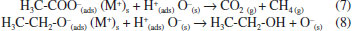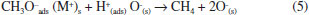 CONCLUSIONS To better understand the transesterification reaction catalyzed by the Mg-La catalyst, surface studies using methanol and ethyl acetate as probe molecules were carried out employing TPD and DRIFTS-MS. TPD analyses showed that methanol adsorbed on 1Mg1LaC catalyst formed formaldehyde and hydrogen via dehydrogenation reaction, whereas adsorbed ethyl acetate produced ethanol and acetone. DRIFTS analyses confirmed that the adsorption of ethyl acetate produced acetate and ethoxy adsorbed species, which produced ethanol and acetone via oxidation reaction, whereas from adsorbed methanol, type II methoxy species, produced formate, and hydrogen. DRIFTS-MS experiments allowed not only the identification of the intermediate species adsorbed on the catalyst surface but also the gas-phase products formed simultaneously. Thus, for the studied catalyst, it was possible to confirm the preferential adsorption of methanol and that EA adsorbs on Mg-La surface in a dissociative form. Also, the coupling of MS to DRIFTS allowed identifying small quantities of gas-phase formed during the heating step, like methane. Surface intermediate's reactions were proposed, which confirmed that the Eley-Rideal type mechanism is the predominant on the studied catalyst surface.