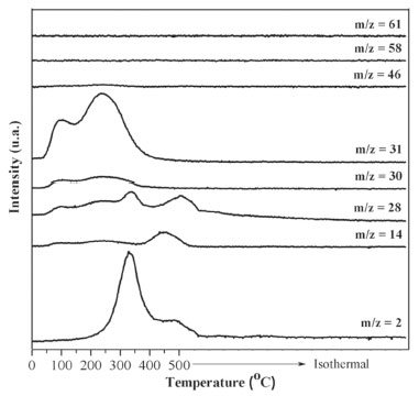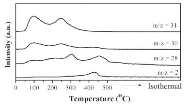 ![]() Figure 2. Temperature-programmed desorption profiles obtained after methanol adsorption at room temperature (m/z: hydrogen = 2; formaldehyde = 30, 28; methanol = 31)