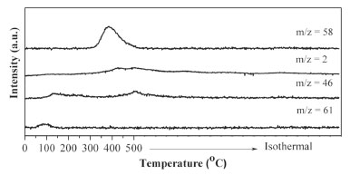 ![]() Figure 3. Temperature-programmed desorption profiles obtained after ethyl acetate adsorption at room temperature (m/z: hydrogen = 2; ethanol = 46; acetone = 58; ethyl acetate = 61)