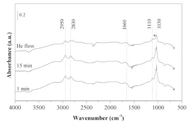 ![]() Figure 5. DRIFT spectra of the catalyst 1Mg1LaC after adsorption of methanol at 30 ºC for 1 min, 15 min, and after a flow of He, at 30 ºC