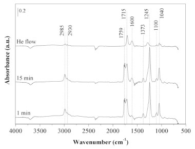 ![]() Figure 6. DRIFT spectra after adsorption of ethyl acetate on 1Mg1LaC at 30 ºC for 1 min, 15 min, and after treatment of He flow