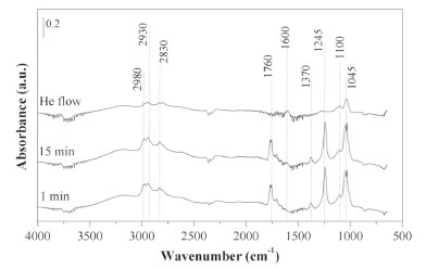 ![]() Figure 7. DRIFT spectra of the catalysts 1Mg1LaC after adsorption of the mixture, methanol and ethyl acetate 1:1, at 30 ºC, during 1 min, 15 min, and after He flows