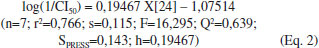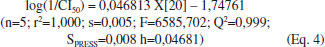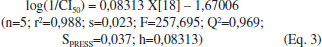 Para gerar os modelos matemáticos do Grupo 2 foram selecionados os compostos ciclosporina, lusutrombopag, triparanol, remdesivir, cloroquina. Esses compostos apresentam valores de CI50 entre 3,78 e 12,00 μmol L-1. Para esse grupo observou-se que os compostos escolhidos apresentaram valores de alinhamento estrutural tridimensional (3D) para N1 entre 0,233 e 0,333, similiaridade tridimensional 3D com N3 entre 0,284 a 0,391 e similiaridade tridimensional 3D com N9 entre 0,260 e 0,398. Dentre as equações geradas, são apresentados dois modelos (Equações 3 e 4) os quais apresentaram parâmetros estatísticos adequados. A Equação 3 apresenta previsibilidade do modelo de 96,9% (Q2=0,969x100) e h positivo da equação (coeficiente angular), indicando que o parâmetro X[18], raio máximo de projeção, contribui positivamente para o modelo gerado. O modelo gerado (Eq. 3) apresenta alta significância (valor F), boa correlação (r2=0,988) e baixos desvios padrão (s e SSPRESS). ![]() A partir da validação externa utilizando a Equação 3 a relação entre log(1/CI50)Observado e log(1/CI50)Previsto indica que os menores valores dos resíduos são observados para homoharringtonina e ivermectina (Tabela 3).