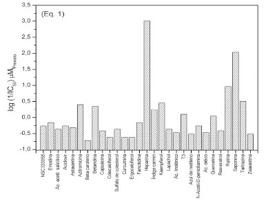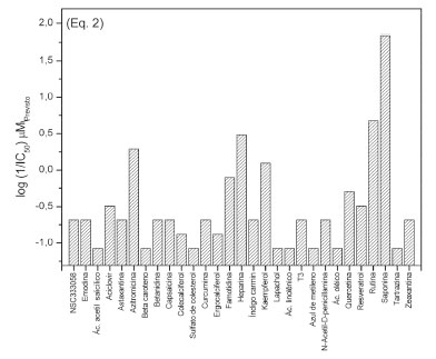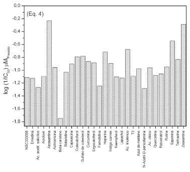 A Equação 4 apresenta previsibilidade do modelo de 99,9% (Q2=0,999x100) e h positivo (coeficiente angular) da equação, indicando que o parâmetro X[20], comprimento perpendicular à área mínima, contribui positivamente para o modelo gerado. O modelo de QSAR gerado (Eq. 4) apresenta os melhores parâmetros estatísticos dentre os quatro modelos gerados (Eq. 1-4), apresentando alta significância (valor F), boa correlação (r2=1,00) e baixos desvios padrão (s e SSPRESS). A correlação entre os valores de log(1/CI50)Previsto versus log(1/CI50)Observado para as Equações 3 e 4 indicam boa linearidade dos modelos de regressão (Figura 3S e Figura 4S), sendo os melhores modelos obtidos. ![]() A partir da validação externa utilizando a Equação 4 a relação entre log(1/CI50)Observado e log(1/CI50)Previsto indica que os menores valores dos resíduos são observados para atazanavir, homoharringtonina e ivermectina (Tabela 4). Mesmo um modelo matemático apresentando bons parâmetros estatísticos, os valores dos resíduos algumas vezes podem ser superiores a uma unidade. Isso pode estar correlacionado com diferentes mecanismos de ação entre os compostos utilizados para gerar o modelo e os compostos selecionados para a validação ou incapacidade de explicar o aspecto tridimensional das interações fármaco-receptor.7 De modo geral, os resíduos resultam de erros aleatórios relativos à determinação experimental dos valores de Y (log(1/CI50)) e/ou a especificação imprópria do modelo. Os resíduos indicam uma variabilidade que o modelo não pode explicar.21 Dentre os parâmetros físico-químicos e descritores moleculares utilizados para a obtenção dos modelos matemáticos, observa-se que os modelos de QSAR que possuem compostos com baixa similaridade estrutural entre N1, N3 e N9 geram modelos com baixa predição (Eq. 1). Os parâmetros que mais interferem e permitem validar as equações são: número de doadores de ligação de hidrogênio (Eq. 2), raio máximo de projeção (Eq. 3) e comprimento perpendicular à área mínima (Eq. 4). Isso infere dizer que há um sinergismo entre a capacidade básica do sítio de ação da proteína de cisteína presente no vírus e as condições geométricas para o alinhamento tridimensional nos potenciais compostos com ação anti-SARS-Cov-2, devido a similaridade estrutural com as estruturas dos inibidores peptidomiméticos covalentes, conforme descrito na literatura.18-20,27 A literatura descreve compostos que apresentam alta atividade biológica contra o vírus, mas seu emprego é inviável pela toxicidade ou efeitos colaterais e a similaridade estrutural é um fator importante a ser considerado,18 conforme também observado a partir dos modelos matemáticos propostos por este trabalho. A semelhança estrutural com a protease principal (Mpro) foi um parâmetro chave para poder compreender os modelos matemáticos gerados. Os modelos de QSAR gerados e apresentados nas Equações 1-4 foram aplicados aos 29 compostos selecionados para triagem. Do grupo de triagem, os compostos ácido acetil salicílico, azitromicina, azul de metileno, colecalciferol, curcumina, ergocalciferol, famotidina, heparina e T3 estão com tag de testes clínicos na plataforma PubChem.23 A Tabela 2S contém os números CID dos compostos para pesquisa na referida plataforma. A partir dos 29 compostos selecionados para triagem, foram calculados os valores da atividade biológica prevista (log(1/CI50)Previsto) (disponível na Tabela 4S). Dentre estes compostos observa-se que os compostos com as maiores atividades previstas (log(1/CI50)Previsto) para: i) Equação 1 são: heparina, saponina, rutina, tartrazina, kaempferol e azitromicina (Figura 2); ii) Equação 2 são: saponina, rutina, heparina, azitromicina, kaempferol e famotidina (Figura 3); iii) Equação 3 são: astaxantina, zeaxantina, saponina, ácido linolênico, heparina e colecalciferol (Figura 4); e iv) Equação 4 são: astaxantina, zeaxantina, saponina, ácido linolênico, heparina e sulfato de colesterol (Figura 5). É importante destacar que as equações indicam muitos dos compostos que tem tag de testes clínicos sobre SARS-CoV-2. A Tabela 5S também apresenta a atividade biológica prevista (log(1/CI50)Previsto) para os 35 compostos da série em estudo a partir das quatro equações geradas por este trabalho e os respectivos resíduos.