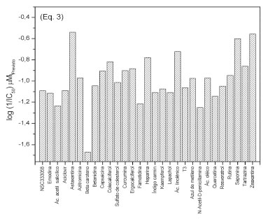 ![]() Figura 3. Compostos selecionados para triagem com as atividades previstas log(1/CI50)Previsto a partir da Equação 2