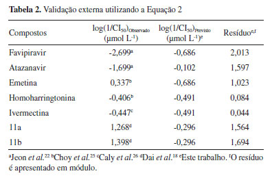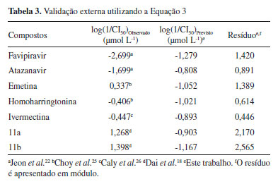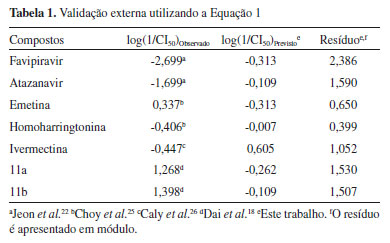 RESULTADOS E DISCUSSÃO Correlação entre CI50 e descritores da estrutura tridimensional (3D) Os testes de avaliação das equações geradas levaram em consideração: i) verificação do grau de ajuste do modelo (cálculo do coeficiente de correlação (R) e do desvio-padrão (s)); ii) verificação do grau de significância do modelo (cálculo do teste F); e iii) verificação do grau de previsibilidade do modelo e das variáveis selecionadas (validação cruzada, cálculo do coeficiente de correlação (Q2) e do desvio padrão da validação cruzada (sPRESS)), sendo estas as avaliações exigidas para um modelo de regressão linear ser aceito.21 Na primeira etapa, foram geradas equações para os 35 compostos. As equações obtidas não apresentaram bons resultados estatísticos, apresentando baixos coeficientes de correlação (R), altos desvios-padrão (s), baixa significância (baixo F), baixa previsilidade (Q2) e alto desvio padrão da validação cruzada (sPRESS), indicando que os compostos investigados apresentam diferentes mecanismos de ação. Na segunda etapa, para a construção do modelo foram selecionados cinco compostos descritos por Jeon et al.,22 que apresentam os maiores valores de log(1/CI50) para SARS-CoV-2, sendo digoxina, digitoxina, niclosamida, proscilaridina e hexaclorofeno, com valores de CI50 entre 0,190 e 2,040 μmol L-1. Observou-se que os valores de similiaridade tridimensional 3D com N1 estavam entre 0,060 e 0,327, similiaridade tridimensional 3D com N3 entre 0,140 e 0,319 e similiaridade tridimensional 3D com N9 entre 0,096 e 0,334. Dentre as muitas equações geradas (QSARs), a Equação 1 foi a que apresentou os parâmetros estatísticos mais adequados, mas mesmo assim, não é uma equação estatisticamente aceitável, pois apesar de ser um modelo com previsibilidade de 89,4% (Q2=0,894x100) e h positivo (coeficiente angular), que indica que o parâmetro X da equação contribui positivamente para o modelo gerado, ela apresenta baixa significância (baixo F), baixa correlação (r2=0,135) e altos desvios padrão (s e SSPRESS). O parâmetro X[27] utilizado para gerar o modelo é o número de sítios aceptores de ligação de hidrogênio. A correlação entre os valores de log(1/CI50)Previsto versus log(1/CI50)Observado indicam a presença de compostos que geram grandes resíduos no modelo de regressão (Figura 1S), denominados de outliers.21 ![]() Como critério de investigação, foi realizada a validação externa utilizando a Equação 1. A relação entre log(1/CI50)Observado e log(1/CI50)Previsto indica valor dos resíduos ≤ 2,386 (Tabela 1). Estes compostos provavelmente apresentam diferentes mecanismos de ação o que é uma variável a ser considerado na flutuação dos valores dos resíduos.