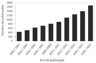 ![]() Figura 1. Relação aproximada do número de publicações científicas envolvendo enriquecimento de alimentos entre os anos de 2000 e 2019