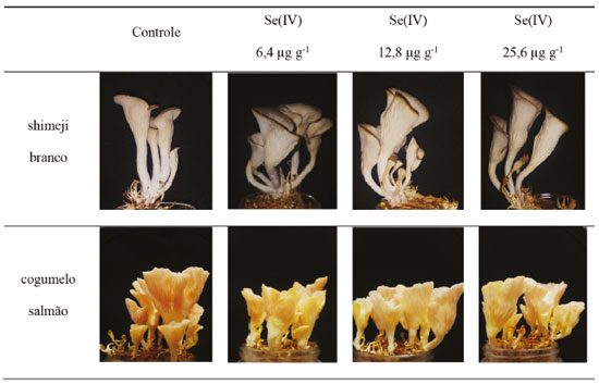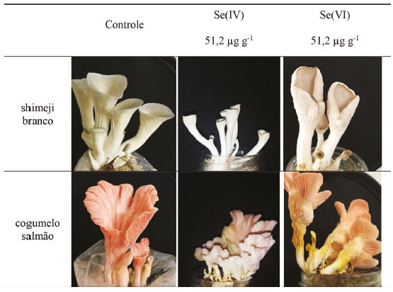 ![]() Figura 3. Morfologia do primeiro ciclo de frutificação dos cogumelos salmão (Pleurotus djamor) e shimeji branco (Pleurotus ostreatus) cultivados em 100 g de substrato orgânico a base de bagaço de cana-de-açúcar composto por 5% (m m-1) de farelo de arroz, 5% (m m-1) de farelo de trigo e 4% (m m-1) de CaO inoculado com sementes dos fungos, sendo o grupo controle cultivado com adição de água desionizada ao substrato inoculado e os grupo enriquecidos com Se(IV) ou Se(IV) a partir da adição de 5 mL de solução aquosa de Na2SeO3 ou Na2SeO4 com concentrações variáveis de forma a obter-se 51,2 µg g-1 de Se(IV) ou Se(VI) adicionado em função da massa de 100 g do substrato inoculado