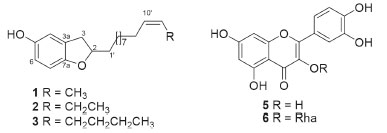 EXPERIMENTAL General procedures The solvents (MeOH, EtOAc, CH2Cl2, CHCl3 and hexane) employed in extraction and chromatographic techniques were all PA purchased from Quimex. In the CC were used Sigel 60 (0.063-0.200 and 0.040-0.063 mm) from Merck and Acros and, in TLC 60 F254 (Merck) precoated plates. The TLC monitoring were revealed by UV (254 and 365 nm) lamps, iodine fumes and Lieberman-Burchard reagent, prepared by the mixture of 10 mL sulfuric acid, 10 mL acetic anhydride in 50 mL of cold EtOH. The IR spectra were registered in the FT Shimadzu spectrophotometer mod IRAffinity-1 employing dry KBr plates or pellets. The 1H and 13C NMR spectra (mono and bidimensional) were carried out in the Varian® (GEMINI 2000) and Bruker (DRX 500) spectrometer using traditional pulse sequences for the homonuclear and heteronuclear correlation experiments. Optical rotations were performed using a Perkin-Elmer model 341 Polarimeter employing a microcell. The mass spectra were obtained on a negative ESI LCMS Shimadzu spectrometer mod. 2010A and in the EI (70 eV) HP mass detector mod. 5973. The UV spectra were recorded in a CARY I Varian spectrophotometer. The HPLC/DAD analysis were recorded in a Dionex equipment (mod. UltiMate 3000) with an injection volume of 10 μL. A DIONEX C18 column (120 Å 3.0 x 75 mm) with 5μm particles diameter was used. As eluent system, gradient mixtures MeOH (B) and 0.2% of aqueous acid formic (A): 30-50% of B for 15 min and 50-100% B from 15 to 20 min of running time at 0.5 mL min-1 flow rate. The detection was registered in 254, 265, 290 and 330 nm UV region. Plant material The seeds and flowers of T. guianensis were collected Universidade Federal da Bahia campus (13°00'02.0"S, 38°30'26.1"W), Salvador (BA), Brazil and a plant voucher (# 032912) is deposited in the Herbarium Alexandre Leal Costa of Instituto de Biologia da UFBA. The access to the species was registered in the Sistema Nacional de Gestão do Patrimônio Genético e Conhecimento Tradicional Associado (SisGen) under number A56BAD6. Extraction and isolation of the constituents of T. guianensis seed extracts The seeds of T. guianensis were previously dried in a forced circulating oven for 48 h at 40 °C, and then ground in a blender. The powdered seeds (316.15 g) were submitted to extraction by maceration by 3x employing hexane for 48 h each one. The extract was concentrated in rotaevaporator furnishing 6.62 g of hexane extract and, sequentially it was submitted to liquid-liquid partition between hexane and MeOH:H2O (95:5). This procedure permitted to obtain the hexane soluble fraction (2.23 g) and the hydroalcoholic one (3.62 g). The hydromethanolic fraction was dissolved in MeOH:H2O (1:1) and also submitted to partition between CH2Cl2, furnishing 3.15 g of the soluble fraction in CH2Cl2. The CH2Cl2 soluble fraction was chromatographed over silica gel 60 (0.063-0.200 mm) and eluted with pure CH2Cl2 and gradient of mixtures of CH2Cl2:MeOH. The CC furnished 19 fractions of 20 mL each and they are monitored and grouped by silica gel TLC (UV lamps and iodine fumes). The first fractions eluted with CH2Cl2 (158.35 g) was then submitted to flash CC, also employing silica gel (0.040-0.063 mm). The fractions eluted with mixtures of CH2Cl2:MeOH furnished the mixture of the new compound identified as 2-[(10'Z)-dodec-10'-enyl]-dihydro-1-benzofuran-5-ol, 2-[(10'Z)-tridec-10'-enyl]-dihydro-1-benzofuran-5-ol e 2-[(10'Z)-pentadec-10'-enyl]-dihydro-1-benzofuran-5-ol (1 - 3, 20 mg) besides β-sitosterol (4, 25 mg). Extraction and isolation of the constituents of the extracts of the flowers of T. guianensis The flowers were previously dried at room temperature, and then ground in a blender and the powered material (344.04 g) was submitted to extraction 3x by MeOH, with about 48 hours for each extraction. The MeOH extract was diluted with H2O to furnished a MeOH:H2O (6:4) solution and sequentially it was partitioned with CH2Cl2, obtaining 6 g of material and, then, EtOAc furnishing 2.50 g of the soluble fraction of this solvent. The CH2Cl2 soluble fraction was submitted to a silica gel 60 (0,063-0,200 mm) CC and eluted with mixtures of CH2Cl2:MeOH, obtaining 20 fractions of 100 mL each. The fraction eluted with 20% of MeOH (479 mg) was submitted to another CC and the fraction eluted with hex:EtOAc (3:2) furnished quercetin (5, 10 mg). The silica gel 60 CC of the soluble fraction of EtOAc (2.50g) eluted with mixtures of CH2Cl2:MeOH, furnished 16 fractions of 100 mL each and the fractions eluted with 30% MeOH (203 mg) was subjected to gel permeation in Sephadex LH 20 eluted with MeOH. This procedure permitted to obtain quercitrin (6, 20 mg) and gallic acid (7, 25 mg). 2-[(10'Z)-Dodec-10'-enyl]-dihydro-1-benzofuran-5-ol, 2-[(10'Z)-tridec-10'-enyl]-dihydro-1-benzofuran-5-ol e 2-[(10'Z)-pentadec-10'-enyl]-dihydro-1-benzofuran-5-ol, (1 - 3). Oil. ESIMS(negative mode) m/z 301, 315 and, 343 ( C20H30O2, C21H32O2 e C23H36O2). [α]25 D +13° (c.1.5, CH3OH). IRνmax film (cm-1): 3347; 3005; 2919; 2850; 1492; 1468; 1199; 862; 814. 1H NMR (400 MHz, CDCl3, δH) and 13C NMR (75 MHz, CDCl3, δC): Table 1.