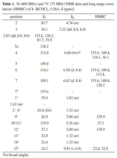 RESULTS AND DISCUSSION From the CH2Cl2 soluble fraction of the hexane extract of the T. guianensis seeds were isolated by CC an inseparable mixture of three new alkyl dihydrobenzofuranoid (1-3, Figure 1) by usual chromatographic techniques. Besides them, β-sitosterol, quercetin, quercitrin and, gallic acid were also obtained. The TLC analysis of this mixture showed just one spot however the negative ESIMS showed [M-H] molecular ions at m/z 301, 315, and 343. These data combined with the peaks observed in the IR, 1H, and 13C spectra, including hydrogen integration and carbon counts, permitted to assign C20H30O2, C21H32O2, and C23H36O2 as the molecular formula. The IR spectrum of 1-3 showed characteristic stretching bands of OH groups of phenolics (υ 3347 and 1199 cm-1) besides aromatic and aliphatic C-H (3005, 2919 and 2850 cm-1), C=C aromatic stretchings between 1492 and 1468 cm-1 and C-H out-of-plan angular deformation of trisubstituted aromatic ring at 862 and 814 cm-1. These findings were corroborated with 1H NMR spectra data, the coupling constants and integration of the peaks at δ 6.68, 6.62, and 6.58 confirmed the substitution pattern of the aromatic ring. The AMX spin coupling system could be confirmed by 1H-1H-COSY experiment, besides H-4 is registered as a broad singlet, the COSY spectrum showed a correlation with δ 6.58 (H-6). The multiplet at δ 5.36 (2H) is characteristic of hydrogens of aliphatic double bond carbons, similar to olefinic hydrogens of unsaturated fatty acids with Z configuration. The presence of an alkenyl chain was also confirmed by the hydrogen peaks at δH 0.91-2.03 ppm. The 13CNMR spectra confirmed all these structural patterns of the compounds. Besides, the peak at δC 83.65 (C-5) was considered as oxymethine carbon once the nature of the hydroxyl group present was determined as phenolic. Thus, the carbon bearing the phenolic OH group is a non-hydrogenated one displayed at δC 153.62 (C-7a). This spectrum also confirmed the Z configuration of the double bond (δC 129.89 and 129.90) of the alkenyl chain by the observed deshielded chemical shifts of the allylic carbons at δC 27.23 and δC 26.95 (C-10'/C-11').11