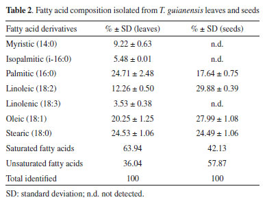 Thioalkylation of 1-3 The derivatives were prepared based on a previously described methodology.8 Briefly, the mixture of 1-3 (3.0 mg) was dissolved in dimethyl disulfide (DMDS 0.2 mL), and iodine (1.0 mg) was added to the solution. The resulting mixture was kept at room temperature for 24 h. Subsequently, the reaction was quenched with aqueous Na2S2O3 (5%), and the mixture was extracted with n-hexane; the hexane layer was concentrated to provide a mixture of DMDS derivatives. Analysis of fatty acids from leaves and seeds of T. guianensis The hexane soluble fraction of seeds and the hexane extract of leaves (prepared employing 35 g of dried and ground T. guianensis leaves and 100 mL of hexane furnishing 1.19 g of extract) for T. guianensis were submitted to transesterification with a solution sodium methoxide (0.5 mol L-1) in 2.0 mL of MeOH and 25 mg of the triglycerides/fatty acids mixture and the reaction was stirred during 30 min. In sequence, H2O was added, and the methyl esters were extracted by partition between hexane. The methyl ester derivatives were analyzed injecting a solution of the hexane extracts in a GC-MS system (Shimadzu CG-2010/QP-2010 high efficiency, coupled with quadrupole mass detector and a Rtx®-1 MS (Crossbond® 100% dimethyl polisiloxane) column of 30 m, Φ 0.25 mm and 0.25 μm of thickness). The speed of carrier gas was set to 40 cm s-1; the carrier gas flow in the column to 0.8 mL min-1; the injection mode was split with a rate of 1:30; the temperature of the injector was set to 280 °C, interface temperature of 260 °C and the oven temperature gradient set to 80 °C (at 2.0 min), rising at 1.5 °C min-1 then 10 °C min-1 to 140 °C, 3 °C min-1 to 200 °C (10 min) and 5 °C min-1 to 250 °C; with the transfer line set to 250 °C; the ion source to 250 °C and an impact energy of 70 eV and voltage detector of 1.3 KV. The methyl ester constituents were identified by molecular ion and analyzing the fragmentation pattern in the mass spectra and comparison with NIST 147 and WYLEY 8 databases. Brine shrimp test For an initial screening on the bioactivity, the adapted Brine Shrimp Lethality assay described by Meyer and co-worker10 was employed to study the general cytotoxicity of the compounds 1-6. Alive brine shrimp (Artemia salina Leach) cysts (500 mg) were transferred to a conical flask containing 3500 mL of artificial seawater. The flasks were aerated with the aid of an air pump and kept at 28 ºC under a bright light and the nauplii hatched after 48 hours approximately. The compounds and extracts were separately dissolved artificial seawater and DMSO to reach the final concentration of 1 mg mL-1. Solutions of 50, 100, 150, 200, 300 e 400 µg mL-1 of extracts and for the 1-3 each compound (25, 50, 75, 100, and 150 μg mL-1) were transferred to vials, which already contained seawater (5 mL) and 10 nauplii. Controls containing DMSO, seawater, and 10 nauplii also performed. The assays were carried out in triplicate. After 24 hours of incubation, the number of live nauplii was counted. The mortality was defined as the absence of controlled forward motion during 30 seconds of observation. The lethal concentration doses for 50% of the brine shrimp (LC50) and the respective 95% confidence intervals were determined by using the GraphPad Prism version 5.0 (GraphPad, La Jolla, CA) software. DPPH scavenging activities Radical scavenging activities of plant extracts were determined through spectrophotometry using the 1,1-diphenyl-2-picrylhydrazyl (DPPH) scavenging radical assay (MeOH, 40 μg mL-1) employing 3 mL of DPPH solution and 1 mL of the samples. The radical scavenging ability was calculated by the formula, % I = [(AbsB − AbsA) / AbsB] × 100, and the IC50 was determined from the linear decrease in the inhibition percentage at λ = 517 nm immediately and after 30 min of incubation at room temperature and the solutions protected from light. Gallic acid was employed as positive control and the extracts were evalueted at different concentrations (50, 100, 150, 200 e 250 µg mL-1).