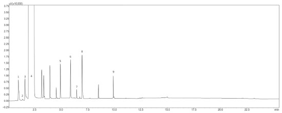 ![]() Figure 1. Chromatogram of the standard volatile mixture. - 1 - acetaldehyde; 2 - methanol; 3 - ethyl acetate; 4 - ethanol; 5- n-propanol; 6 - n-butanol; 7 - isobutanol; 8 - isoamylic; 09 - furfural