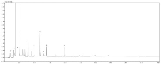 ![]() Figure 2. Chromatogram of the cachaça (RB855453 - Without fertilization) - 1 - acetaldehyde; 2 - methanol; 3 - ethyl acetate; 4 - ethanol; 5- n-propanol; 6 - n-butanol; 7 - isobutanol; 8 - isoamylic; 09 - furfural