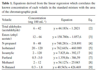MATERIAL AND METHODS Experimental planning The minority volatile compounds were analyzed in the cachaças derived from sugarcane of the varieties RB857515, RB966928 and RB855453, planted without fertilization and with organic and conventional fertilization. Each plot had 37 m2, with 5 furrows of 5.0 m in length and spacing of 1.5 m between the lines, where the three central furrows formed the useful area of the plot and two lateral furrows as borders. Determination of the volatile compounds In Brazil, the determination of the minor volatile compounds in cachaça is regulated by the Ministry of Agriculture, Livestock and Supply and uses the Gas Chromatography and Flame Ionization Detector (GC/FID). In this research, the analyses were performed in a Gas Chromatograph (GC) (Shimadzu, model QP-2010 PLUS, Kyoto, JP), with a NukolTM column (polyethylene glycol, 30 m x 0.25 mm x 0.25 μm) and a flame ionization detector (FID). The temperatures of the detector and injector were fixed at 190 °C and the manual mode of injection with flow division (split) of 1:15 with an injection volume of 1.0 μL of sample, in triplicate. The flow of the drag gas in the column (H2) was of 3.38 mL min-1 with total flow of 57 mL min-1 and pressure of 115 KPa. The programming of the column temperature ramp was of 40 °C (isotherm of 4 min), rise until 150 ºC at a rate of 32 ºC min-1 (isotherm of 5 min) and increase at 25°C min-1 until 220 °C (isotherm of 6 min). In sample preparation, the cachaças were filtered in filter paper with grammage of 80 g m-2 and porosity of 3 µm (Nalgon, São Paulo, BR). Subsequently, these samples were manually injected into the GC.7 The quantification of the volatile compounds was performed by external standardization; for this, a standard solution with known concentrations of acetaldehyde, ethyl acetate, ethanol, acetal, methanol, isopropanol, sec-butanol alcohol, n-propanol, n-Butanol, iso-butanol alcohol, iso-amyl alcohol, n-amyl alcohol and furfural was prepared in different concentrations. The linear regression of the points which correlate the different concentrations of the compounds at the different dilutions of the standard mixture with the areas of the corresponding chromatographic peaks generated the equation used in the calculation of the concentration these volatiles (Table 1). The reagents employed were of analytical grade, without the need for purification.