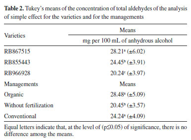 Total aldehydes The concentration of total aldehydes expressed in acetaldehyde concentration was determined by equation (2) (Table 1). The concentration of total aldehydes (mg of acetaldehyde per 100 mL of anhydrous alcohol) in the cachaças was evaluated and subjected to the univariate analysis of variance, at the level of 5% of significance and the Tukey's test. The double interaction was not significant (p-value = 0.051379), indicating that the variety was not dependent on the management in relation to the concentration of this volatile. When the Tukey's means were evaluated for the analysis of simple effect, a significant difference was found among the varieties (p-value = 0.000002) and among the managements (p-value = 0.000001) (Table 2).