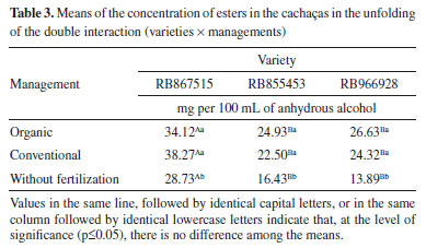 The mean concentration of total aldehydes in the cachaças (Table 2) was of 24.3 mg.100 mL-1 of anhydrous alcohol. The values all samples are in agreement with the Brazilian legislation which determines the maximum content of total aldehydes, expressed in acetaldehyde of 30 mg L -1 of anhydrous alcohol. The concentration of aldehydes in the cachaças produced with different species varied from 20.24 to 28.21 mg of acetaldehyde per 100 mL of anhydrous alcohol. All acetaldehyde concentrations in the cachaças derived from the three varieties differed from each other. The variety RB867515 presented the highest concentration for the levels of total aldehydes, an important information to the sector, since it was the most cultivated RB variety (65%) in the harvest of 2015 in Brazil.9 Analyzing total aldehydes in beverages produced from different sugarcane varieties, did not find a significant difference among the beverages for this variable.10 The mean concentration of total aldehydes from the management without fertilization (20.45 mg of acetaldehyde per 100 mL of anhydrous alcohol) was different from the organic management (28.48 mg of acetaldehyde per 100 mL of anhydrous alcohol), but the organic management did not differ from the conventional management (24.24 mg of acetaldehyde per 100 mL of anhydrous alcohol) (Table 2). Although no significant differences were detected between the acetaldehyde concentrations in the cachaças derived from the fertilizations (organic or mineral), differences were detected between them and the one without fertilization. Considering that the process was the same for all assays, it is verified that fertilization, somehow, has contributed for the beverages to reach higher contents of total aldehydes. Esters The concentration of esters in the cachaças produced with different management conditions and varieties is expressed in ethyl acetate. To calculate the concentration, equation (2) was employed (Table 1) considering the area of the peaks of this compound in the cachaças. The concentrations of total esters (mg of ethyl acetate per 100 mL of anhydrous alcohol) in the different cachaças indicated that the double interaction was significant (p-value = 0.00059885) and that the variety was dependent on the management regarding the concentration of total esters in the beverage (Table 3).