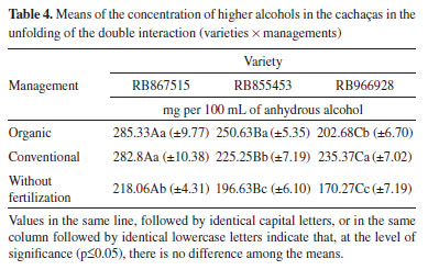 In the analysis of the means for the levels of total esters in the cachaças, among all managements, the sugarcane variety RB867515 differed significantly from varieties RB855453 and RB966928 (capital letters in the same line) (Table 3). This result evidences that the sugarcane variety, because of its specific features, causes differences in the levels of total esters in the cachaça. For the levels of total esters, it is emphasized that there was a significant difference in the cachaça produced from sugarcanes without fertilization in the planting (lowercase letters in the same column) (Table 3). Nevertheless, fertilization (organic or mineral) has influenced the sugarcane varieties for a higher formation and levels of total esters in the beverage. No studies have been found evaluating total esters between beverages from conventional and organic managements. Esters contribute to the characterization of cachaça, in physical-chemical and sensory terms. After analyzing the results of the total esters concentrations (Table 3), but close to the values found by Lima et al.11 In addition to the irregular collection of the beverage fraction, high levels of total esters in the cachaças can also be attributed to factors such as the addition of a nitrogen supplement in the fermentation, use of micronutrients, level of establishment of the fatty acids present in the fermentation, yeast strains, sudden oscillations in fermentation temperature and the quality of the sugarcane which has originated the must. The sugarcanes and beverage production were maintained under rigorous procedure to avoid differentiations in the process.12 Higher alcohols According to the legislation, the levels of higher alcohols in cachaça come from the sum of the n-propanol, isobutanol and isoamyl alcohols. The maximum limit is of 360 mg, expressed by the sum of these alcohols, in 100 mL of anhydrous alcohol.2 The concentration of higher alcohols was determined in relation to the chromatographic peaks of the higher alcohols in the cachaça determined by equation (4) for n-propanol, equation (5) for isobutanol alcohol and equation (6) for isoamyl alcohol (Table 1). The concentrations of higher alcohols in the cachaças were evaluated and the double interaction was significant (p-value = 0.00059885), indicating that the variety is dependent on the management in relation to the concentration of these compounds (Table 4).