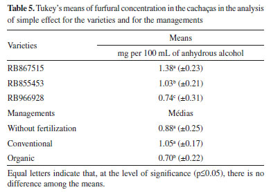 In all management systems, the Tukey's means of the sugarcane varieties differed significantly from each other (Table 4). The varieties influenced the levels of higher alcohols in the beverage, for how much that the levels of higher alcohols in cachaça might suffer an influence from the composition and origin of the raw material and must used for beverage production.1 The means of the values of the higher alcohols (Table 4) varied from 170.27 mg to 285.33 mg per 100 mL of anhydrous alcohol, in agreement with the national legislation. Barcelos et al.,13 found values close to the same range (176.58 to 235.12 mg per 100 mL of anhydrous alcohol) in a study where they evaluated cachaças derived from the South of Minas Gerais. Boscolo et al.,2 also found the mean of 262 mg per 100 mL of anhydrous alcohol for higher alcohols in cachaças. Another factor related to the content of these compounds is an adequate distillation process, with a correct correction between the fractions names "head", "heart" and "tail", as they have different concentrations of higher alcohols.13 Furfural The concentration of furfural, as well as the other volatiles, was determined relating the area of the chromatographic peak in each cachaça converted into concentration by the use of equation (7) (Table 1). The Tukey's mean of furfural concentration (mg of acetaldehyde per 100 mL of anhydrous alcohol) in the cachaça by the double interaction was not significant (p-value = 0.213378), indicating that the variety is not dependent on the management in relation to furfural concentration in the beverages. In the analysis of the means for simple effect, no significant difference was found between the managements without fertilization and conventional (p-value = 0.219382). The cachaça produced with the organic management was different from the others, presenting the lowest furfural concentration (Table 5).