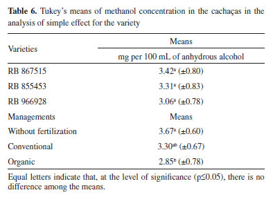 The means of furfural concentration varied from 0.74 mg per 100 mL of anhydrous alcohol to 1.38 mg per 100 mL of anhydrous alcohol (Table 5) and all are in agreement with the Brazilian legislation, which advocates the value of up to 5.0 mg per 100 mL of anhydrous alcohol for furfural and hydroxymethylfurfural. When the furfural concentration among the varieties is evaluated, it is observed that it varied significantly (Table 5) (p-value = 0.005562) indicating that RB966928, regardless of the management, presented almost half the concentration present in the other varieties. Furfural's presence is harmful to the organism and undesirable in cachaça, since it reduces the quality of the beverage, affecting its aroma and flavor, because of its specific sensory characteristics. The formation of this volatile has several justifications, possibly resulting from the chemical decomposition of carbohydrates, by the degradation of pentoses during the fermentation stage or in distillation by pyrogenization of the organic matter deposited at the bottom of the stills and aging.14,15 The mean furfural concentrations in the different cachaças followed the same differences found among the means of the values of total aldehydes (Table 2). Methanol The methanol concentrations (mg of methyl alcohol per 100 mL of anhydrous alcohol) of the cachaça were determined correlating the area of the peak of this compound with the methanol concentration using equation (8) (Table 1). By the analysis of the Tukey's means, the double interaction was not significant (p-value = 0.58409), indicating that the variety was not dependent on the management in the evaluation of methanol concentration in the beverages. When the variance of the means was evaluated for the analysis of simple effect, no significant difference was found among the varieties (p-value = 0.45494) and for the managements there was significant variation (p-value = 0.03768) (Table 6).
