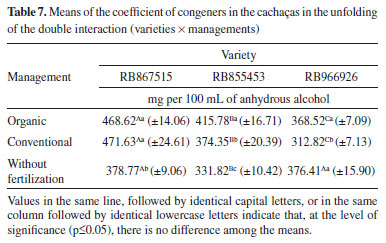 Methanol has the maximum limit of 20 mg per 100 mL of anhydrous alcohol.2 The means in relation to the level of methanol (Table 6) varied from 2.85 mg to 3.67 mg per 100 mL of anhydrous alcohol. They are all in accordance with the Brazilian legislation. The means of the methyl alcohol levels differed significantly between the management without fertilization (3.67 mg per 100 mL of anhydrous alcohol) and the organic management (2.85 mg per 100 mL of anhydrous alcohol), which did not differ significantly from the conventional management (3.30 mg per 100 mL of anhydrous alcohol), which also did not differ from the management without fertilization (Table 6). No studies were found correlating the methanol levels with the origin of the cachaça produced from sugarcanes cultivated under different managements. Coefficient of congeners The main components of the distilled beverages are ethanol and water, besides the volatile compounds formed mainly during the stages of fermentation, distillation and storage of the beverage.14 The concentrations of the coefficient of congeners of the cachaça were determined correlating the concentration of the volatile acidity, aldehydes, esters, higher alcohols and furfural. In the analysis of the mean concentrations of the congener coefficient in the cachaças, it was verified in the analysis of variance that the double interaction was significant (p-value = 0.00000000131), indicating that the variety is management dependent in relation to the concentration of the same volatile compound (Table 7).