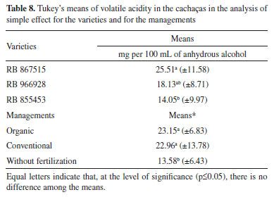 The means of the congener levels in all managements varied among all sugarcane varieties, which is noticeable in the capital letters in each line (Table 7). Since this variable is the sum of the volatile acidity, aldehydes, esters, higher alcohols and furfural, these results show that for this variable, the management influences the formation of volatiles during cachaça production. For the cachaça produced from the sugarcane variety RB867515, they differed significantly when the management was without fertilization. The means for the same variable for variety RB855453 differed significantly in all managements (Table 7). Also, the means of the levels of congeners for variety RB966928 differed only in the conventional management. The mean of all samples varied from 336.77 to 388.75 mg per 100 mL of anhydrous alcohol, an approximate value to that found by a study, who evaluated the coefficient of congeners from different cane varieties.16 The different sugarcane varieties and fertilization (organic and mineral) contributed and influenced in the chemical profile of the cachaças produced. The means in relation to the level of congeners varied from 312.82 mg to 471.63 mg per 100 mL of anhydrous alcohol and all are in accordance with the Brazilian legislation, which advocates a range whose value is inferior to 200 mg per 100 mL of anhydrous alcohol and superior to 650 mg per 100 mL of anhydrous alcohol. Volatile acidity Among the secondary products, the acetic acid is the most important component of the acid fraction of the cachaças. The volatile acidity in cachaça must not exceed 150 mg of acetic acid per 100 mL of anhydrous alcohol.2 In the analysis of variance of the concentration of acidity in the different cachaças, the double interaction (varieties × managements) was not significant (p-value = 0.055560), indicating that the variety is not dependent on the management in relation to the concentration of volatile acidity. When the means were analyzed, significant difference was found among the varieties (p-value = 0.004203) and among the managements (p-value = 0.001163) (Table 8).