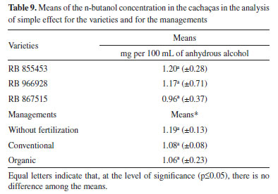 The means in relation to the n-butanol level (Table 9) varied from 0.96 mg to 1.20 mg per 100 mL of anhydrous alcohol. All samples are in agreement with the Brazilian legislation. The means of the n-butanol levels were not significantly different among the managements and varied from 1.06 mg per 100 mL of anhydrous alcohol for the organic management to 1.19 mg per 100 mL of anhydrous alcohol for the management without fertilization. Furthermore, no studies were found correlating the n-butanol levels with the origin of the cachaça produced from sugarcanes cultivated under different managements. Schmidt et al.,19 analyzed cachaças derived from the State of Rio Grande do Sul and found values above the allowed by the Brazilian legislation of the contaminant n-butanol. This result is contrary to that found in the present work.