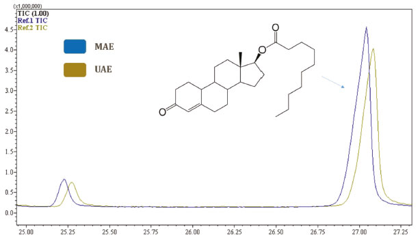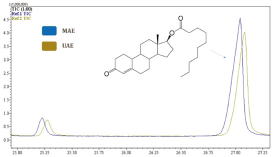 The use of Infrared Spectroscopy was a feasible tool in order to introduce the student on the analytical techniques used in the detection of AAS. The spectroscopic analysis was a demonstration to the classroom that the determination of the active ingredient in a formulation can be a difficult task due to inferences of the matrix.17,18 In this sense, the use of a sequence of analytical techniques is favored in order to achieve precise conclusions about the nature of the sample.19 Moreover, the student could be familiarized with the instrumentation and manipulation of the equipment and interpretation of bands in the infrared spectra, which are important skills to their future careers. Extraction and GC-MS analysis GC-MS analysis allowed the student to conclude that Product #1 did not have its alleged active ingredient and was only composed of oily components. This conclusion was based on the lack of any peak in the chromatogram related to testosterone propionate, which placed the sample as a falsified material. This information was previously known and, therefore, Product #1 was not used in the comparison of extraction procedures. On the other hand, Product #2 had its active ingredient detected (Figure 2S) and several excipients in the form of ethyl esters of fatty acids and benzyl benzoate (Figure 3S). Mass spectra fragmentation showed a molecular ion of m/z 428 and a base peak of m/z 274 which corresponds to the cleavage of the ester moiety bonded to the 17β carbon. These fragments indicated the presence of nandrolone decanoate. Given that Product #2 had the steroidal active ingredient it was used for the comparison of extraction procedures. Comparison between the UAE and MAE (Figure 3) showed that the methods yield distinct extraction results of the sample constituents. Since analytical standards were not used in the procedure, the area of the peaks was used as an indicative of the concentration. Nandrolone decanoate had an area of 27,457.444 in UAE and 31,871.523 in MAE, indicating that microwave irradiation was more effective and that the type of extraction considerably influences on the overall results.