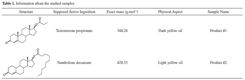 EXPERIMENTAL SECTION Reagents and materials For the experiments, HPLC-grade methanol (Sigma-Aldrich, Saint Louis, USA) was used. The Brazilian Federal Police kindly provided two formulations of AASs (Table 1) with nandrolone decanoate and testosterone propionate as the alleged active ingredients in the samples.
